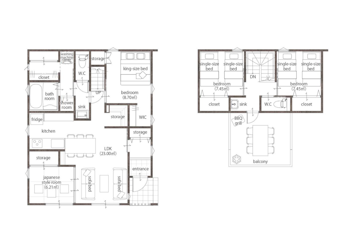 Villa. This air-conditioned villa includes 1 living room, 4 separate bedrooms and 1 bathroom with a bath. Guests will find a refrigerator, kitchenware, a microwave and a toaster in the fully equipped kitchen. The villa also features a barbecue. The villa offers a washing machine, tatami, a tea and coffee maker, a flat-screen TV, as well as mountain views. The unit has 7 beds and 2 futons.