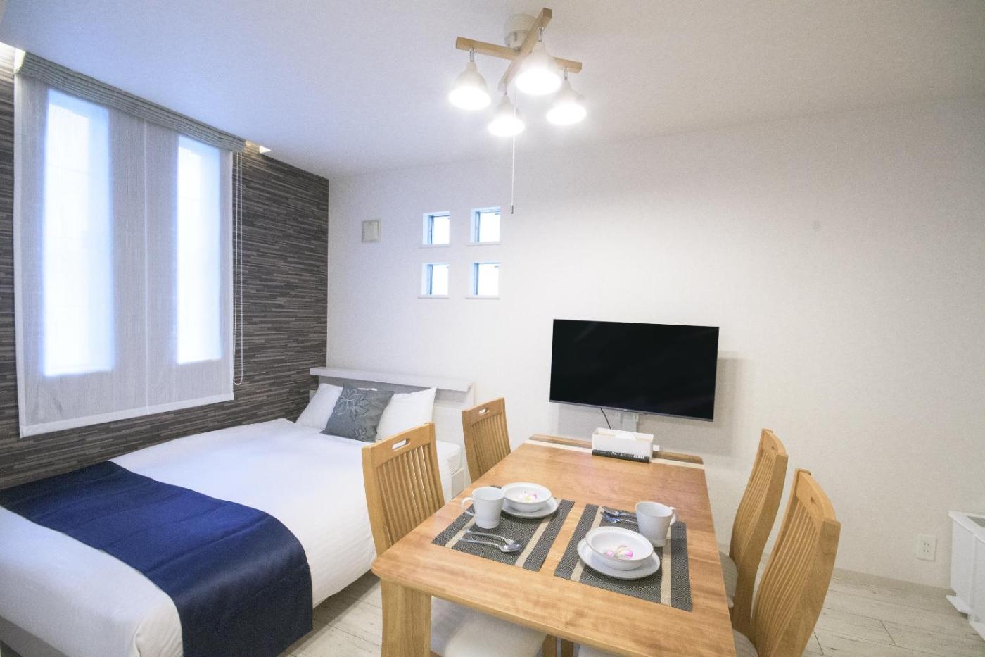 Deluxe Room with Kitchen (2 Double Beds) - Non-Smoking - Cleaning Fee Extra. The air-conditioned apartment features 1 bedroom and 1 bathroom with a bath and a shower. Guests can make meals in the kitchen that is fitted with a stovetop, a refrigerator, kitchenware and a microwave. The apartment offers a washing machine, a wardrobe, an electric kettle, heating and a flat-screen TV. The unit offers 2 beds. ;