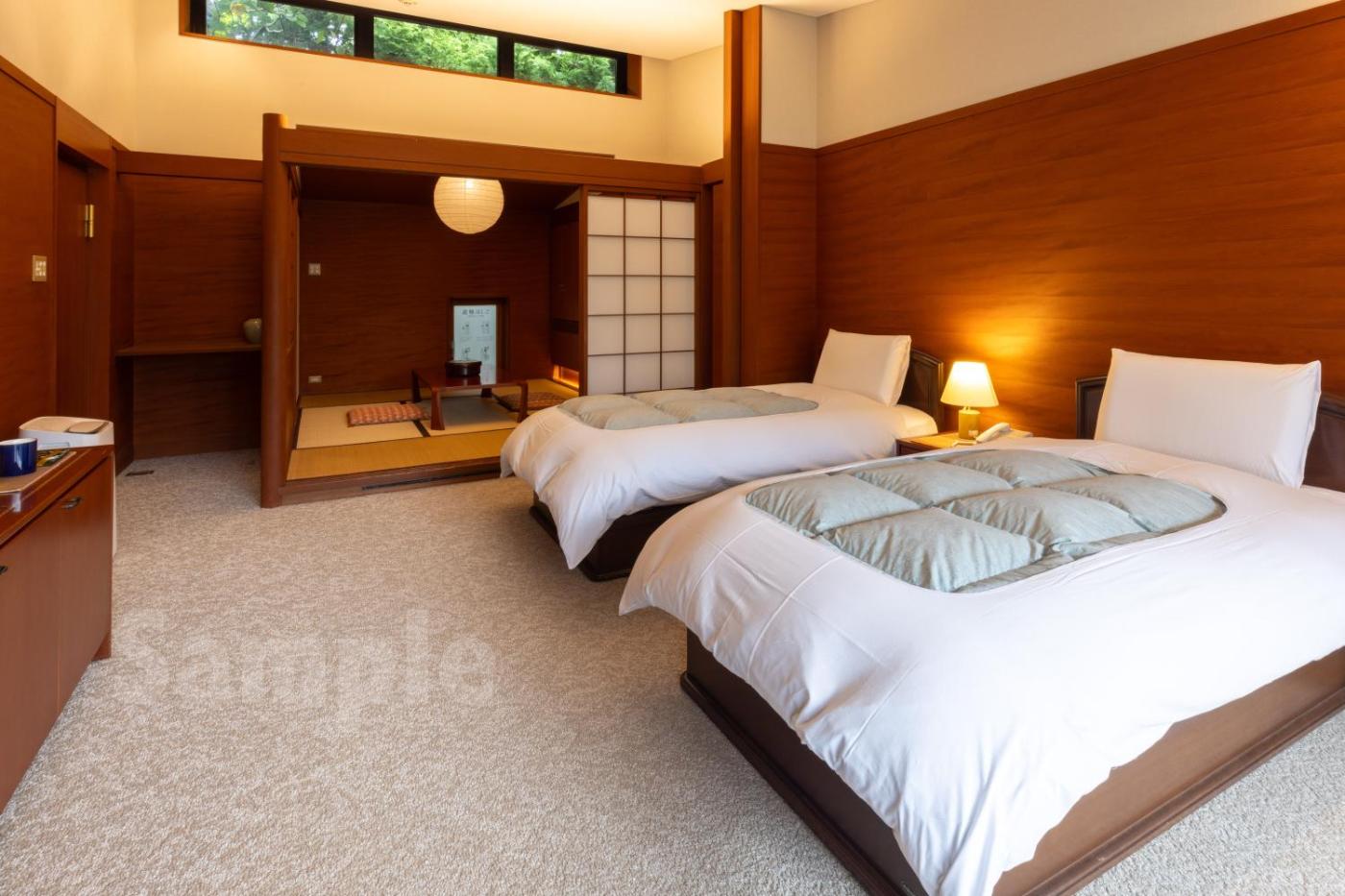 Twin Room with Shared Bathroom. The spacious twin room provides air conditioning, tatami, a terrace with garden views as well as a shared bathroom featuring a bidet. The unit offers 2 beds. ;