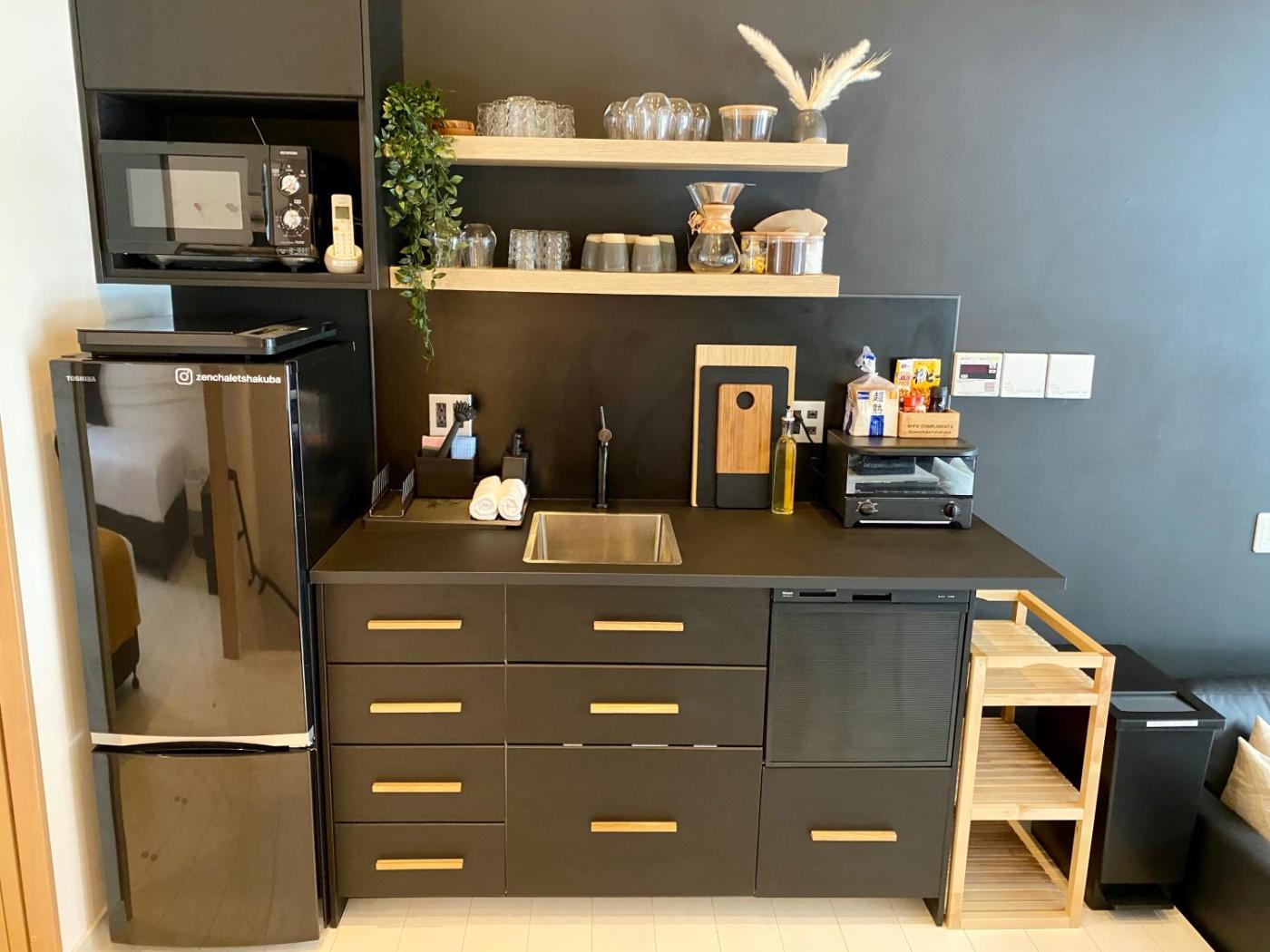 Hakuba Zen Chalets living room is fitted with a flat-screen Apple TV. The kitchen comes with a large fridge, a microwave and cooking stoves. Free toiletries and towels are provided in the en suite bathroom.