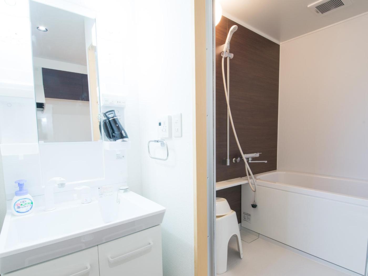 Japanese-Style Quadruple Room. The quadruple room features air conditioning, a washing machine, as well as a private bathroom boasting a bath and a shower. In the fully equipped kitchen, guests will find a stovetop, a refrigerator, kitchenware and a microwave. The quadruple room provides a flat-screen TV, tatami, an electric kettle and heating. The unit has 4 futons. ;