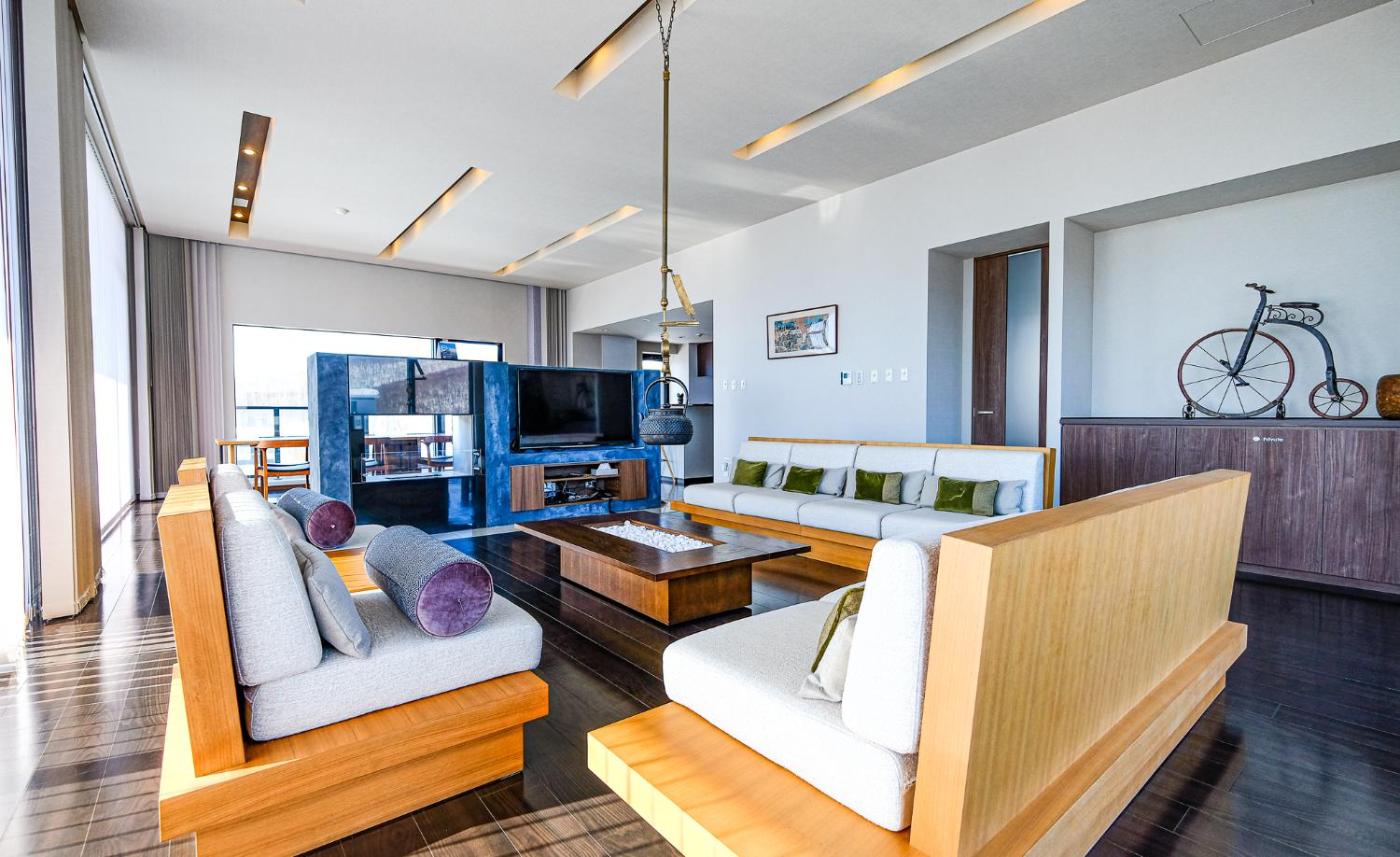 Two-Bedroom Apartment-High Floor. Guests will have a special experience as the apartment features a hot tub. This spacious apartment consists of 1 living room, 2 separate bedrooms and 1 bathroom with a bath and a shower. Guests can make meals in the kitchen that is equipped with a stovetop, a refrigerator, a dishwasher and kitchenware. The air-conditioned apartment provides a flat-screen TV with streaming services, a washing machine, a wardrobe, an electric kettle as well as mountain views. The unit offers 4 beds. ;