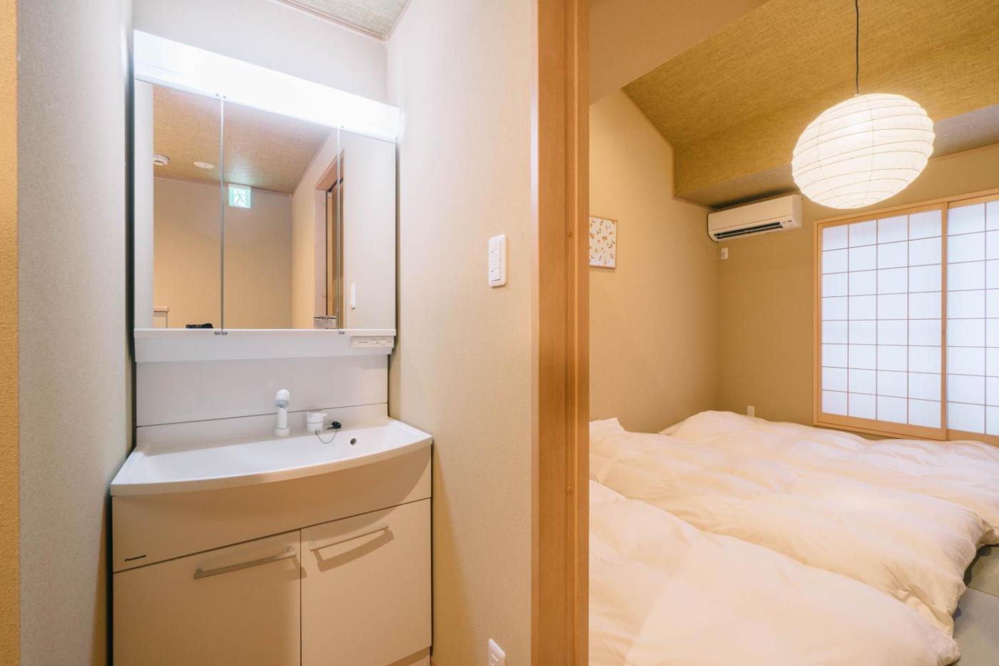 Villa. This villa consists of 1 living room, 2 separate bedrooms and 1 bathroom with a bath and free toiletries. Guests can make meals in the fully equipped kitchen that has a refrigerator, kitchenware and a microwave. The villa features tatami floors and provides air conditioning, a coffee machine and a seating area. The unit offers 6 futons.
