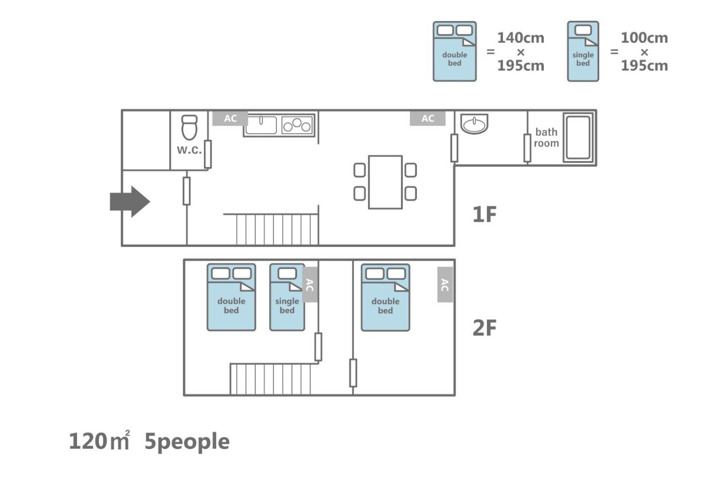 Two-Bedroom House. Featuring a private entrance, this spacious holiday home also is comprised of 2 separate bedrooms and 1 bathroom with a bath and a shower. In the fully equipped kitchen, guests will find a stovetop, a refrigerator, kitchenware and a microwave. The air-conditioned holiday home offers a flat-screen TV, a washing machine, tatami and an electric kettle. The unit offers 3 beds.