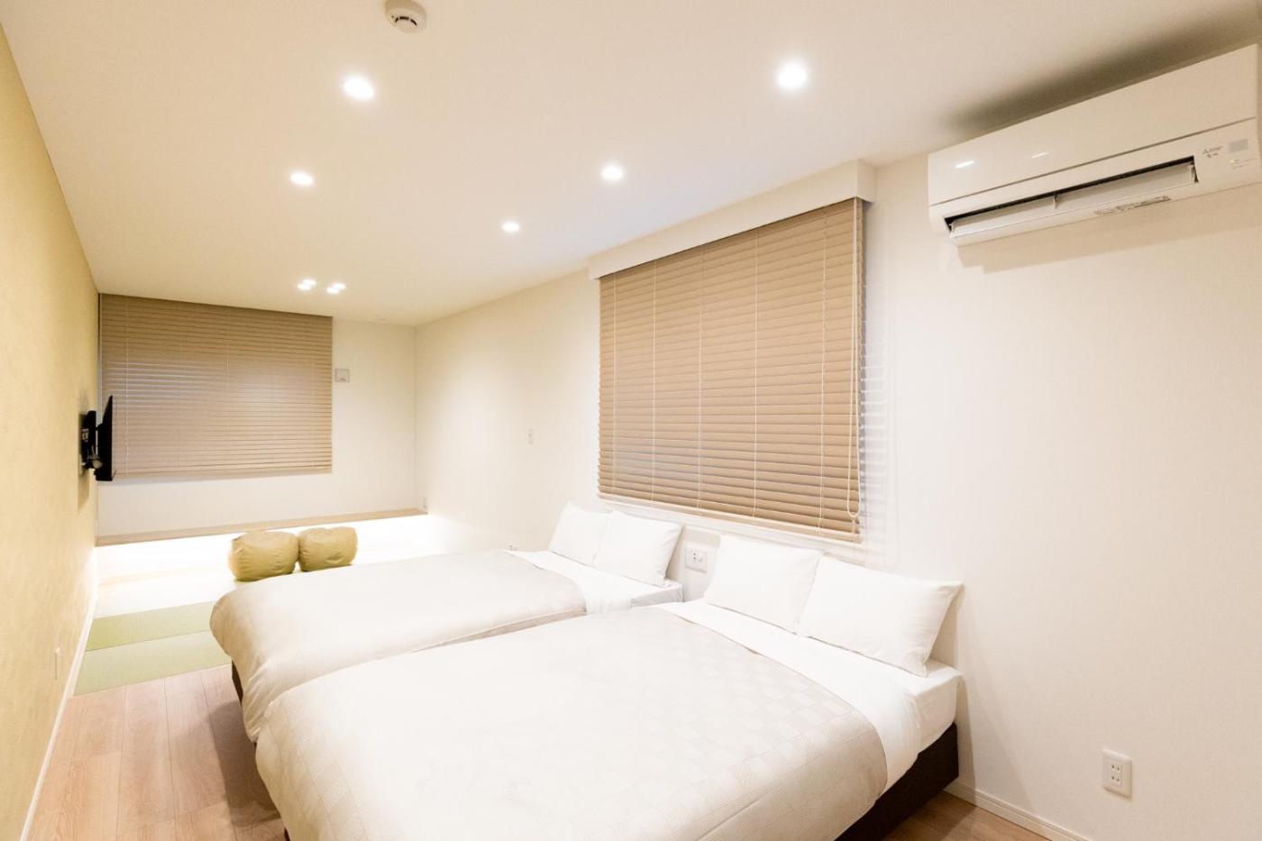 Family Room. The family room includes a private bathroom, well-fitted with a bath, a shower, a bidet, a hairdryer and slippers. The family room provides air conditioning, a washing machine, tatami, a tea and coffee maker and a flat-screen TV with streaming services. The unit offers 2 beds and 1 futon. ;