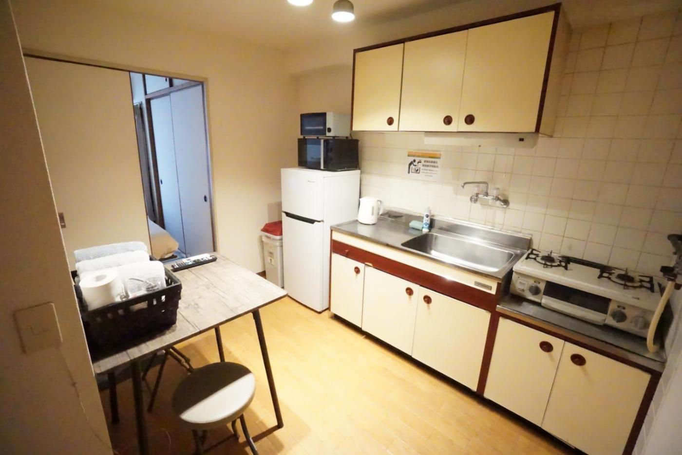 One-Bedroom Apartment. Featuring a private entrance, this air-conditioned apartment is comprised of a kitchen, 1 bedroom and 1 bathroom with a bath and a hairdryer. Meals can be prepared in the well-fitted kitchen, which is fitted with a stovetop, a refrigerator, kitchenware and a microwave. The apartment offers a flat-screen TV, a washing machine, tatami, an electric kettle as well as city views. The unit offers 3 beds.