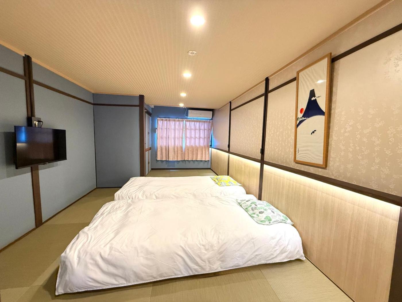 Two-Bedroom Apartment. This apartment offers a hot tub. The air-conditioned apartment features 2 bedrooms and 1 bathroom with a bath and a shower. Meals can be prepared in the well-fitted kitchen, which comes with a stovetop, a refrigerator, kitchenware and an oven. The apartment provides a washing machine, tatami, soundproof walls, a flat-screen TV, as well as city views. The unit offers 3 beds and 4 futons.