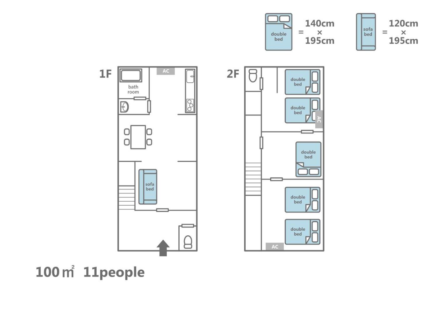 Three-Bedroom House. Featuring a private entrance, this air-conditioned holiday home comprises 1 living room, 3 separate bedrooms and 1 bathroom with a bath and a shower. The well-fitted kitchen features a stovetop, a refrigerator, kitchenware and a microwave. The holiday home provides a washing machine, a dining area, an electric kettle, a sofa and a flat-screen TV. The unit offers 6 beds.