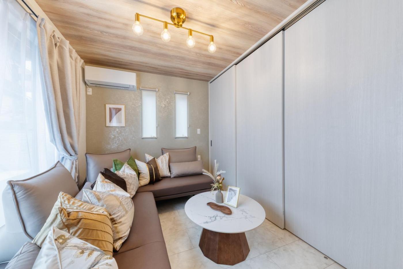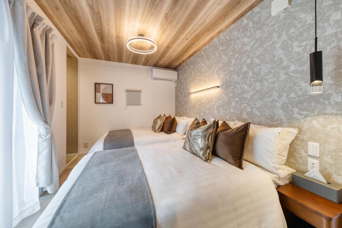 Three-Bedroom Apartment with Balcony. This apartments special feature is the hot tub. Featuring a private entrance, this air-conditioned apartment comprises 1 living room, 3 separate bedrooms and 2 bathrooms with a bath and a shower. The well-fitted kitchen features a stovetop, a refrigerator, a dishwasher and kitchenware. The spacious apartment provides a washing machine, tatami, a tea and coffee maker, a seating area and a flat-screen TV with streaming services. The unit offers 8 beds.
