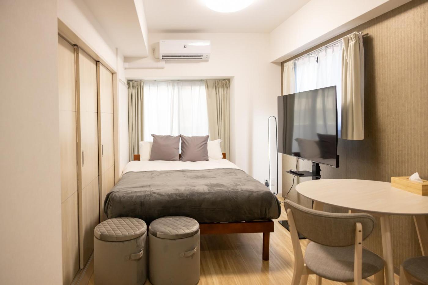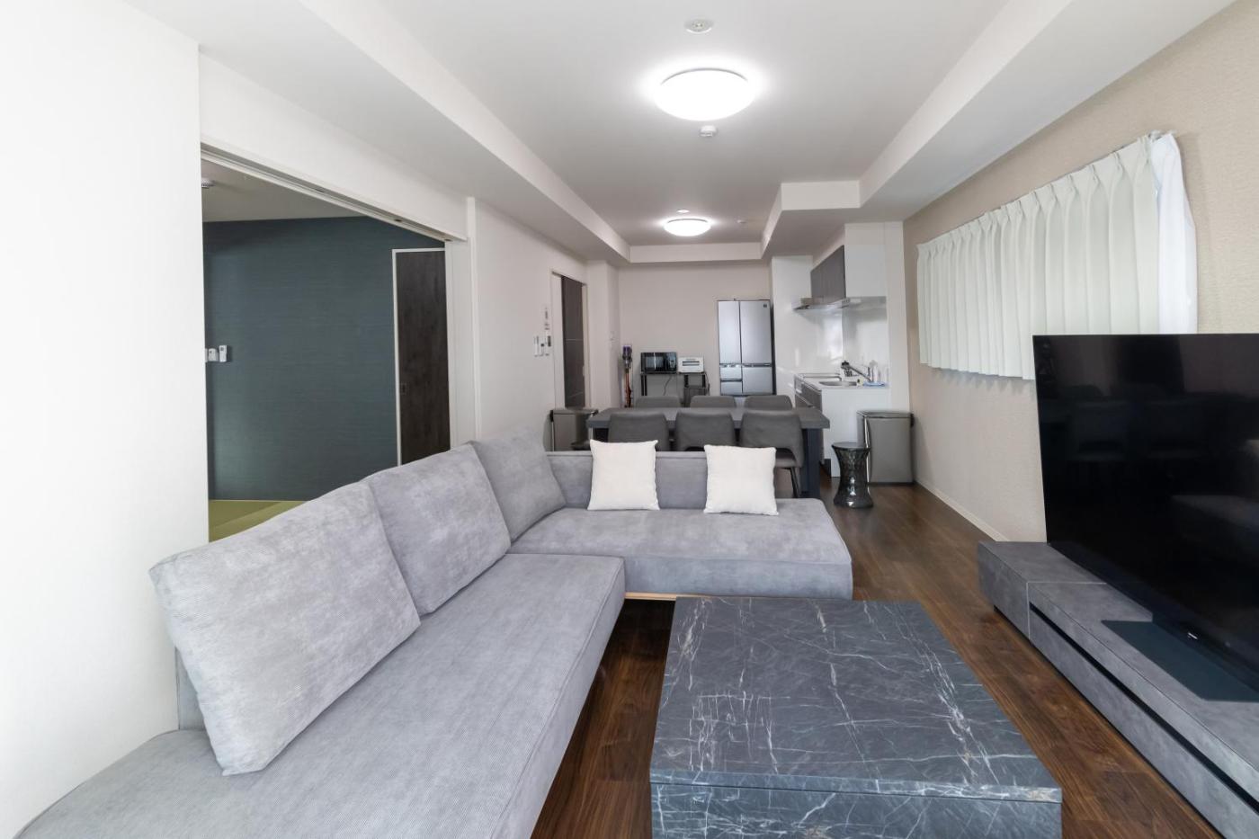 Deluxe Suite. Boasting a private entrance, this air-conditioned suite comes with 1 living room, 2 separate bedrooms and 1 bathroom with a bath and a shower. In the fully equipped kitchen, guests will find a stovetop, a refrigerator, kitchenware and a microwave. The spacious suite features a washing machine, tatami, a dining area, a flat-screen TV, as well as city views. The unit has 2 beds and 3 futons. ;