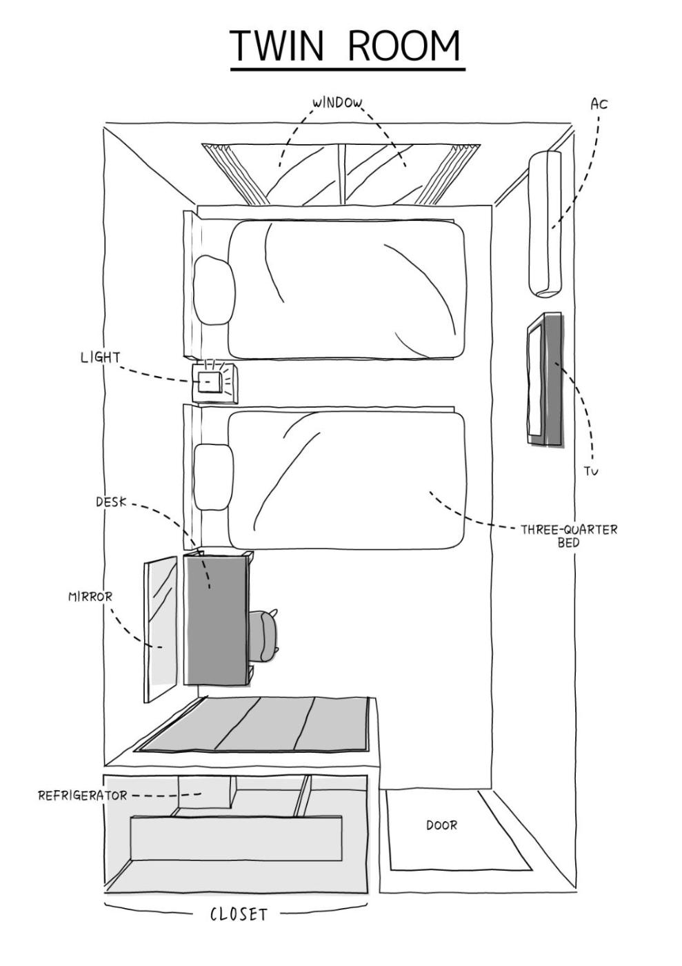 Single Bed in Female Dormitory Room. This bed in dormitory has a tumble dryer, microwave and air conditioning. ;