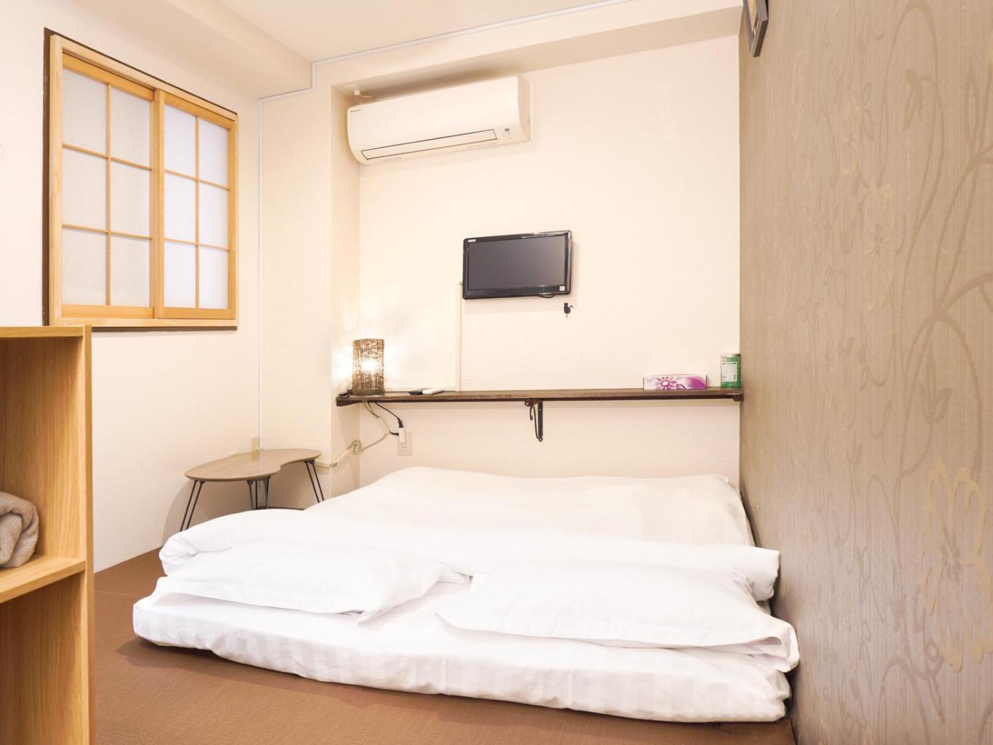 Double Room. Providing free toiletries, this double room includes a private bathroom with a shower, a hairdryer and slippers. The well-fitted kitchen features a stovetop, a refrigerator, kitchenware and a microwave. The air-conditioned double room provides a TV with cable channels, a washing machine, tatami, a private entrance as well as city views. The unit offers 2 futons.