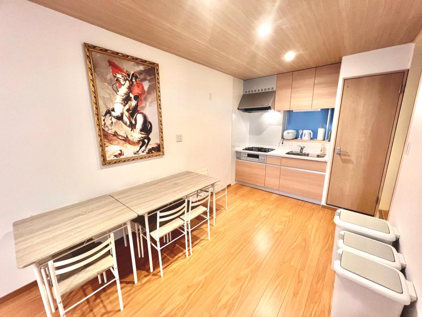 Two-Room Apartment. This spacious apartment consists of 1 living room, 2 separate bedrooms and 1 bathroom with a bath and free toiletries. The well-equipped kitchen features a refrigerator, kitchenware, a microwave and a toaster. This air-conditioned apartment is comprised of a dining area, a flat-screen TV with streaming services a washing machine and tatami. The unit offers 5 beds and 1 futon.