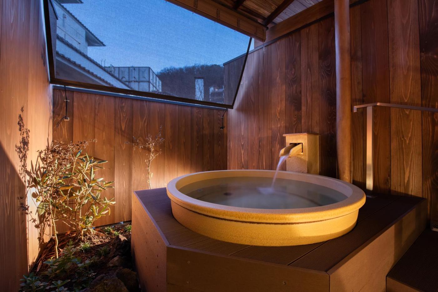 Standard Twin Room. The private open-air bath is the standout feature of this twin room. The twin room features air conditioning, tatami, as well as a private bathroom boasting a bath and a shower. The twin room provides a safe deposit box, an electric kettle, yukata, heating, as well as a flat-screen TV. The unit has 2 futons.