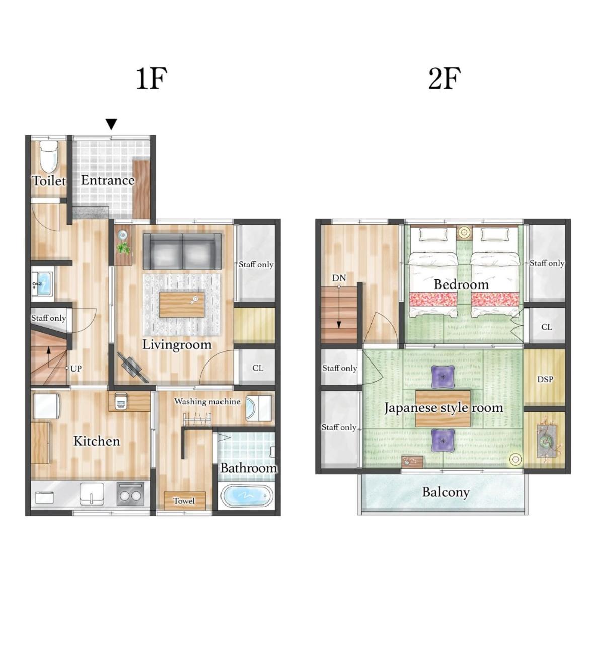 Two-Bedroom House. This holiday home comes with 1 living room, 2 separate bedrooms and 1 bathroom with a bath and free toiletries. The well-equipped kitchen has a stovetop, a refrigerator, an oven and a microwave. The holiday home features air conditioning, a washing machine, tatami, a tea and coffee maker and a flat-screen TV with streaming services. The unit has 2 beds and 2 futons.