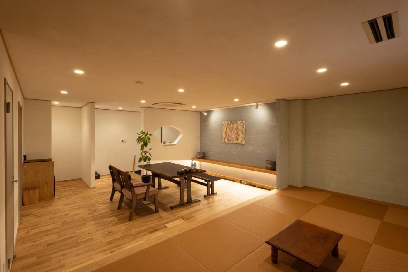 Family Room with Bath. The hot tub is the standout feature of this family room. The spacious family room features air conditioning, a washing machine, as well as a private bathroom boasting a bath and a shower. The family room has tatami floors and provides a tea and coffee maker, a dining area and a quiet street view. The unit has 4 beds.