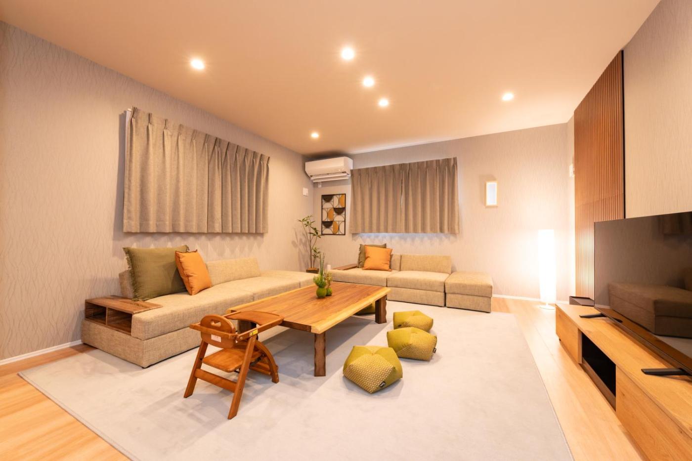 Five-Bedroom House. This spacious holiday home includes 1 living room, 5 separate bedrooms and 2 bathrooms with a bath and free toiletries. In the fully equipped kitchen, guests will find a stovetop, a refrigerator, a dishwasher and kitchenware. The holiday home offers air conditioning, a washing machine, tatami, a dining area and a flat-screen TV. The unit has 8 beds and 3 futons.