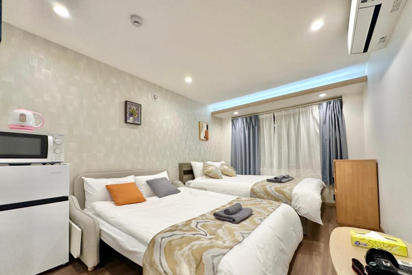 Standard Triple Room. The spacious triple room provides air conditioning, a washing machine, as well as a private bathroom featuring a bath and a hairdryer. The triple room features tatami, a private entrance, a wardrobe, an electric kettle and a flat-screen TV. The unit offers 3 beds and 5 futons. ;