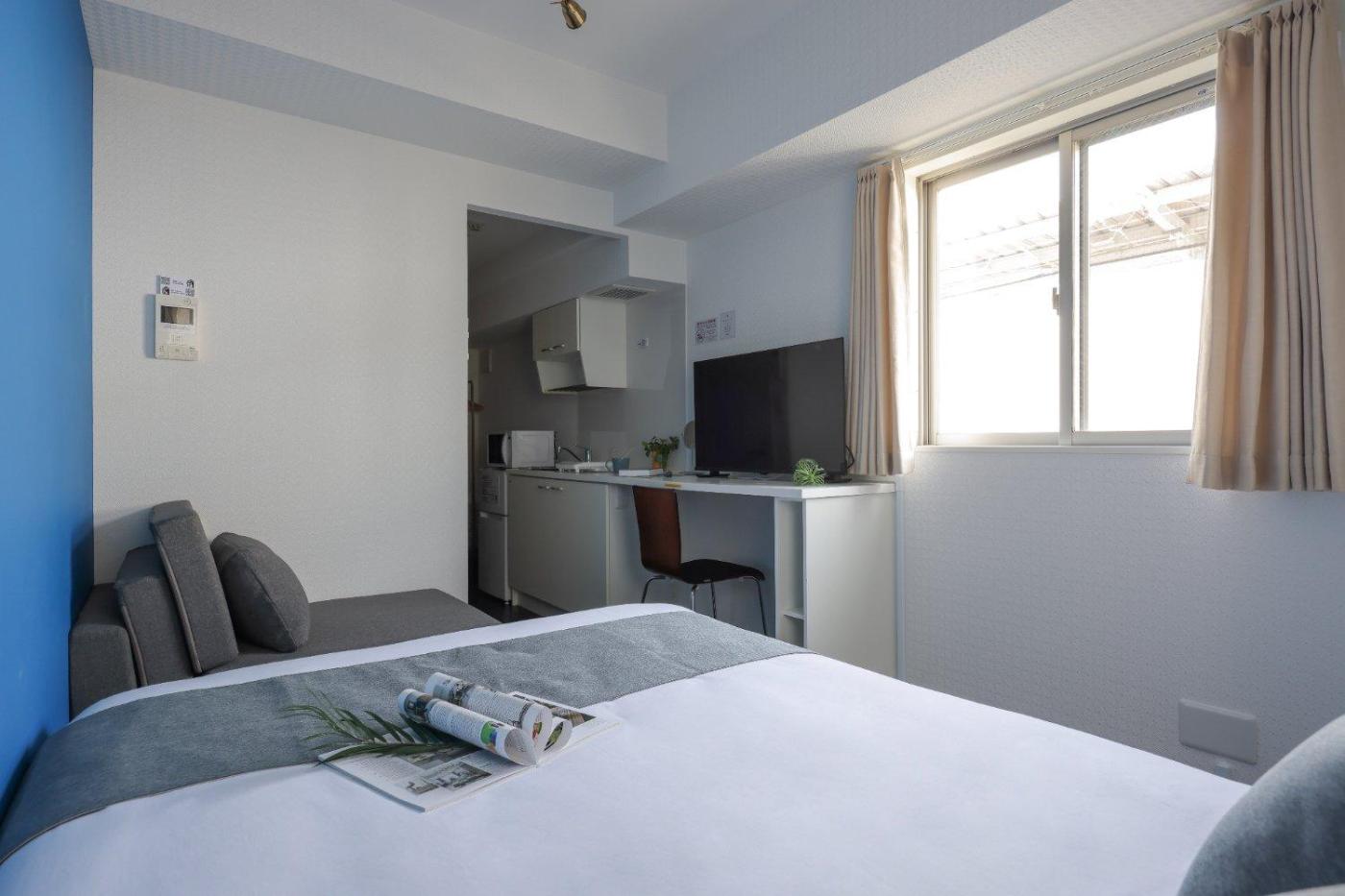 One-Bedroom Apartment. The air-conditioned apartment features 1 bedroom and 1 bathroom with a bath and a shower. Guests can make meals in the kitchen that is equipped with a stovetop, a refrigerator, kitchenware and a microwave. The apartment provides a washing machine, a wardrobe, an electric kettle, as well as a balcony. The unit offers 2 beds. ;