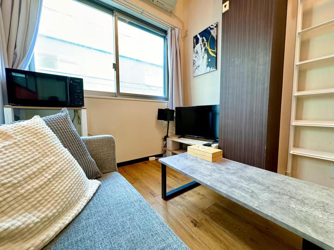 One-Bedroom Apartment. Boasting a private entrance, this air-conditioned apartment comes with 1 living room, 1 separate bedroom and 1 bathroom with a bath and a shower. The fully equipped kitchenette has a stovetop, a refrigerator, kitchenware and a microwave. This apartment features a washing machine, an electric kettle, a flat-screen TV and a quiet street view. The unit has 1 bed and 2 futons.