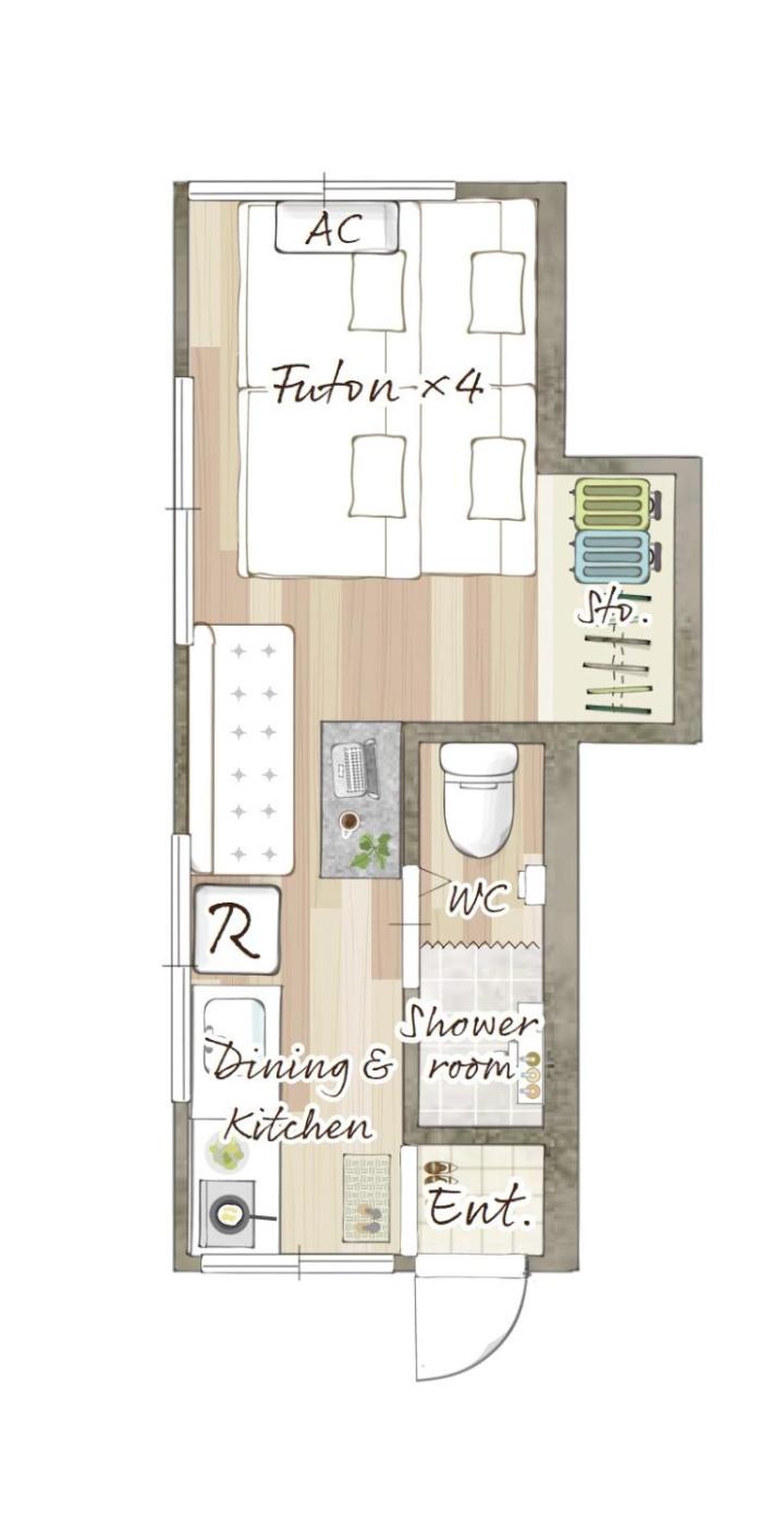Three-Bedroom Apartment. Featuring a private entrance, this air-conditioned apartment comprises a kitchen, 1 bedroom and 1 bathroom with a shower and a hairdryer. The well-fitted kitchen features a stovetop, a refrigerator, kitchenware and a microwave. The apartment has parquet floors and provides an electric kettle, a sofa and heating. The unit offers 1 bed and 4 futons.
