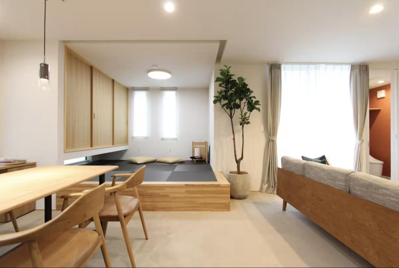 Family Room with Balcony. This family room features a hot tub. The spacious family room provides air conditioning, a washing machine, as well as a private bathroom featuring a bath and a shower. Guests can make meals in the kitchen that comes with a stovetop, a refrigerator, kitchenware and an oven. Boasting a balcony, this family room also offers tatami, soundproof walls and a flat-screen TV. The unit offers 3 beds and 2 futons. ;